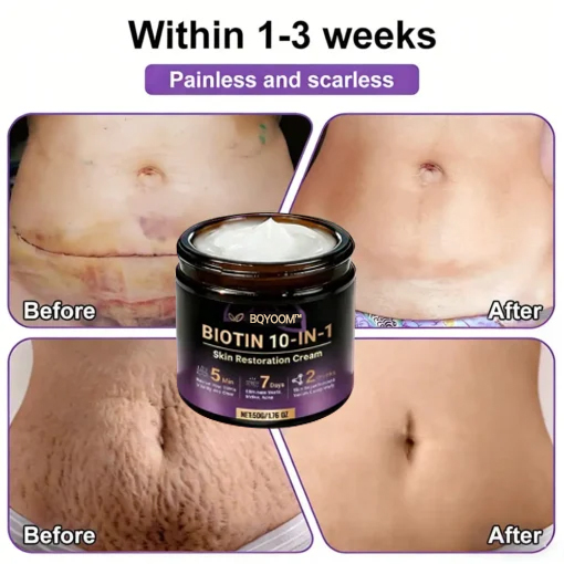 Scars, stretch marks, and acne marks often form due to collagen breakdown and inflammatory damage in the deeper layers of the skin. BQYOOM™ Biotin 10-in-1 Skin Restoration Cream combines Centella Asiatica and collagen peptides to promote skin regeneration and repair — studies show scar depth can reduce by up to 42% within 14 days. Niacinamide and salicylic acid help calm redness and balance oil production, while aloe vera and colloidal oatmeal soothe irritation.