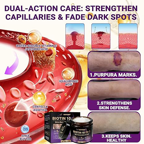 Age spots and senile purpura are often caused by sun exposure and fragile capillaries. BQYOOM™ Biotin 10-in-1 Skin Restoration Cream combines alpha-arbutin, water-soluble vitamin C, and hyaluronic acid to brighten the complexion, visibly improving uneven pigmentation within 7 days. Centella asiatica strengthens capillaries, helping purpura fade by up to 68% in 14 days. Biotin and collagen peptides accelerate the natural shedding of pigmented cells, boosting skin renewal efficiency by 35%.