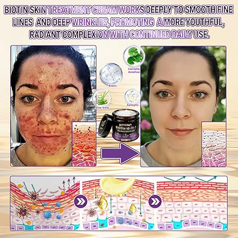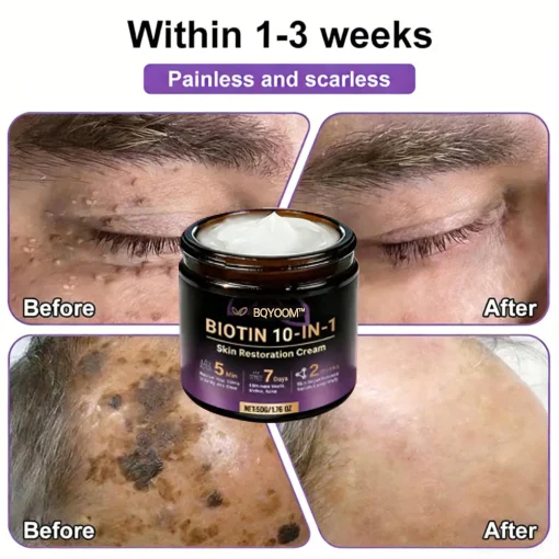 Say goodbye to the discomfort caused by skin tags, psoriasis, vitiligo, varicose veins, sagging, wrinkles, and age spots. Use BQYOOM™ Biotin 10-in-1 Skin Restoration Cream to restore smooth, youthful, and radiant skin without the hassle.