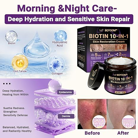 Dry and sensitive skin often suffers from dehydration and a weakened barrier, making it prone to redness, stinging, and flaking. BQYOOM™ Biotin 10-in-1 Skin Restoration Cream provides deep hydration with biotin and hyaluronic acid, while ceramides restore barrier integrity and reduce 57% of water loss in 14 days. Colloidal oatmeal and aloe vera soothe inflammation, instantly lowering skin temperature by 1.5°C and reducing redness by 62%.