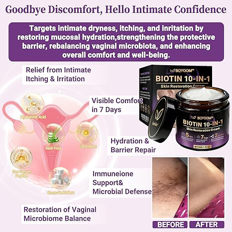 Intimate itching is often linked to dryness, microbiome imbalance, and mild inflammation. BQYOOM™ Biotin 10-in-1 Skin Restoration Cream offers gentle relief through a science-backed blend of soothing and moisturizing ingredients. Hyaluronic acid deeply hydrates the mucosal tissue, providing long-lasting moisture, while aloe vera calms irritation and redness. Ceramides strengthen the natural protective barrier, and biotin, collagen peptides, and Omega-3-rich grass-fed tallow help regulate local immunity and rebalance microflora by promoting healthy Lactobacillus growth.