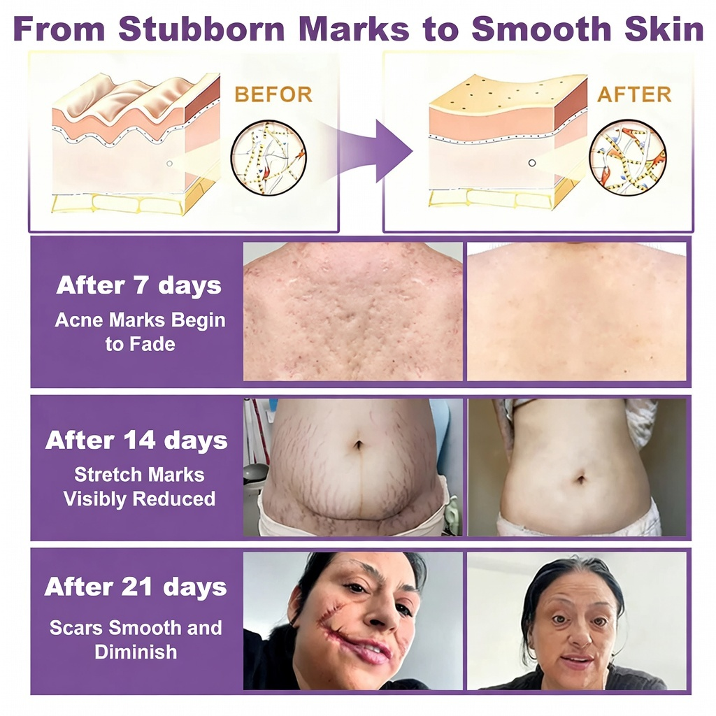 Meanwhile. biotin and collagen peptides accelerate cell renewal. and Omega-3-rich grass-fed tallow. shea butter. and jojoba oil provide essential fatty acids that restore softness and flexibility. With regular use. the skin becomes smoother. more even. and visibly renewed — scars fade. stretch marks soften. and acne marks lighten within 2–4 weeks.