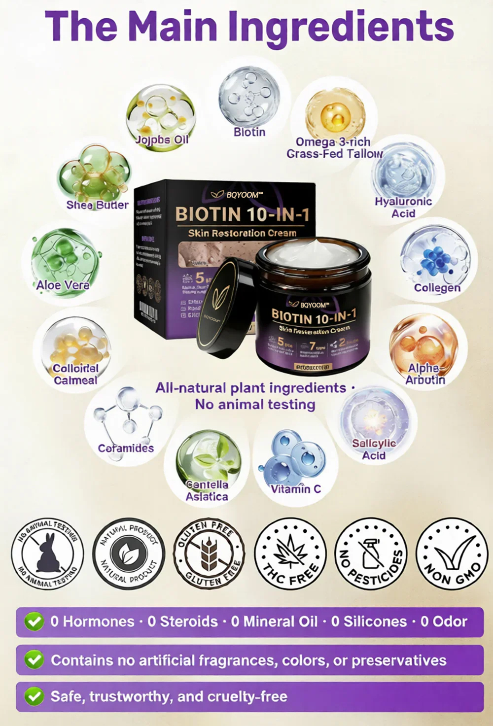 Clinically tested by dermatology experts. the BQYOOM® Biotin 10-in-1 Skin Restoration Cream features a revolutionary. natural formula with triple-strength upgrades. Clinically noticeable improvements in just 7 days — no side effects or irritation.