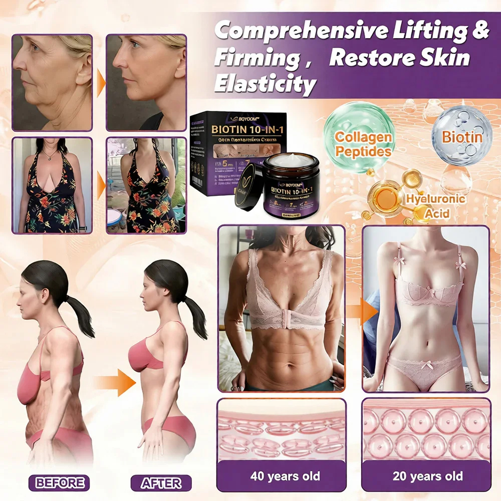 As we age. our skin naturally loses collagen. causing areas like the chest and buttocks to become less firm and elastic. BQYOOM® Biotin 10-in-1 Skin Restoration Cream contains collagen peptides that work deep within the skin to rebuild the collagen network. restoring strength and bounce. Biotin and collagen peptides help stimulate new collagen production. while hyaluronic acid and Omega-3-rich grass-fed tallow (rich in stearic acid) deeply moisturize and nourish the skin. Shea butter and jojoba oil enhance smoothness. plumpness. and elasticity. leaving the skin feeling firmer and more toned.