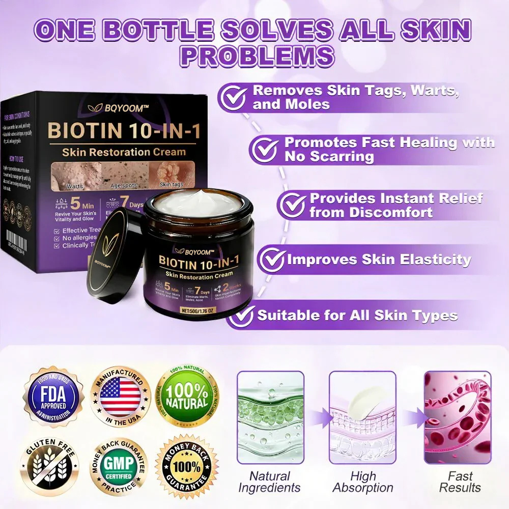 Say goodbye to the discomfort caused by skin tags. psoriasis. vitiligo. varicose veins. sagging. wrinkles. and age spots. Use BQYOOM® Biotin 10-in-1 Skin Restoration Cream to restore smooth. youthful. and radiant skin without the hassle.