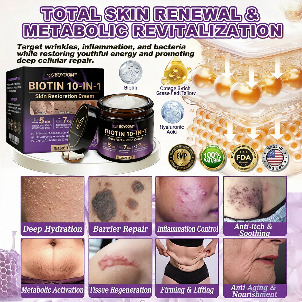In response. BQYOOM® Biotin 10-in-1 Skin Restoration Cream was scientifically developed under rigorous standards. Its formula combines the restorative power of natural biotin and collagen. synergized with hyaluronic acid. vitamin C. centella asiatica. and over ten other potent bioactive ingredients. Together. they deliver multi-dimensional care — from deep hydration and barrier repair to anti-inflammatory relief. itch control. metabolic renewal. tissue restoration. and anti-aging nourishment. Clinically validated and produced in GMP-certified facilities compliant with U.S. and EU safety standards. this cream offers a safe. effective. and drug-free multi-repair skincare solution for dryness. inflammation. irritation. and signs of aging — restoring comfort. resilience. and lasting skin health.
